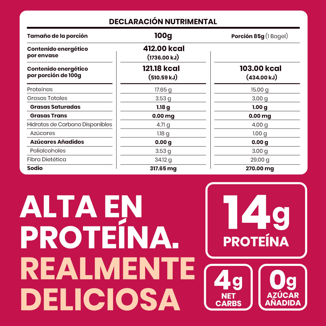 Este bagel ofrece una experiencia frutal irresistible, con un delicioso sabor a arándano en cada mordida. Su textura esponjosa y su perfil alto en proteína lo convierten en una opción perfecta para quienes buscan algo dulce, nutritivo y funcional sin salirse de su estilo de vida low carb.