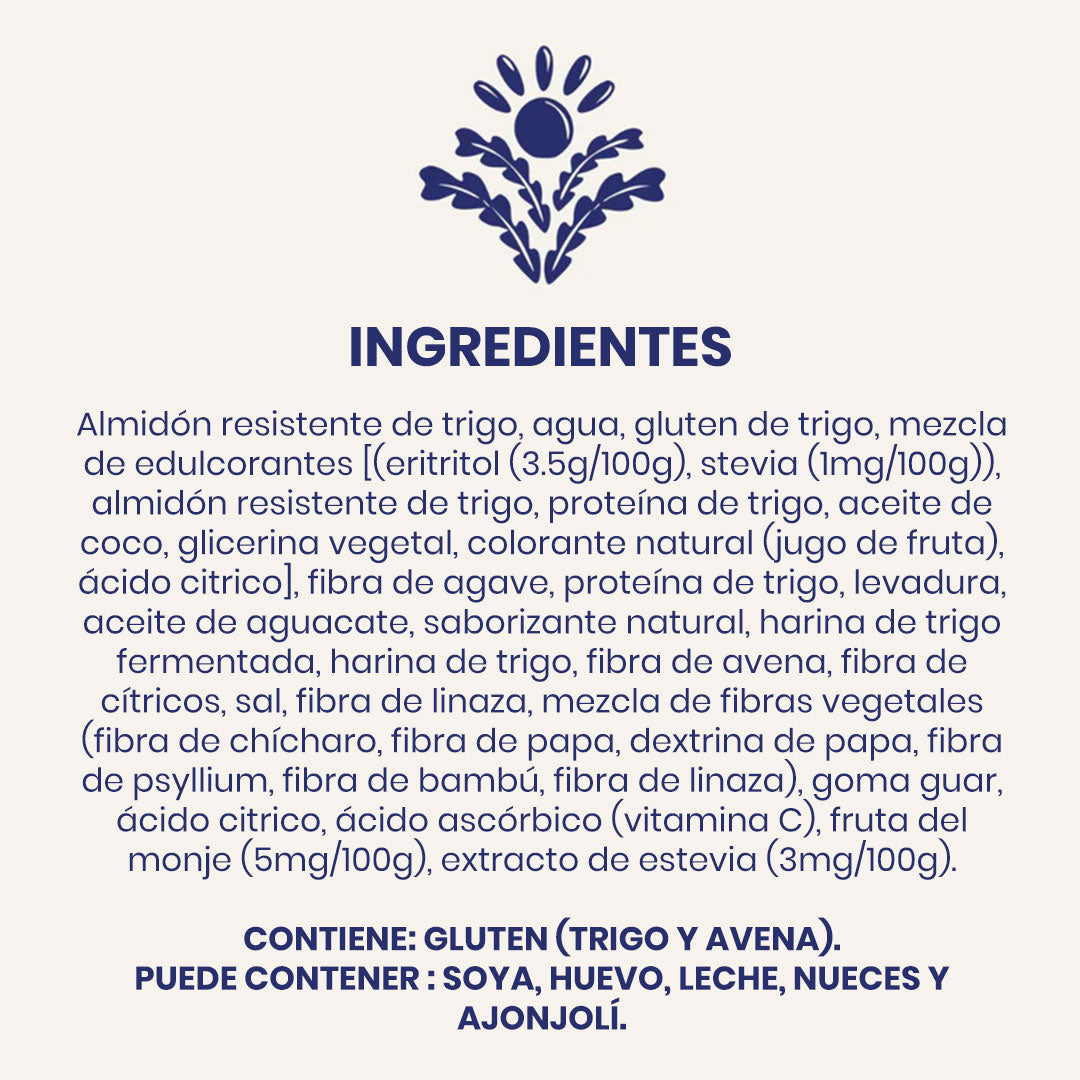 Ingredientes: Almidón resistente de trigo, agua, gluten de trigo, mezcla de edulcorantes [(eritritol (3.5g/100g), stevia (1mg/100g)), almidón resistente de trigo, proteína de trigo, aceite de coco, glicerina vegetal, colorante natural (jugo de fruta), ácido citrico], fibra de agave, proteína de trigo, levadura, aceite de aguacate, saborizante natural, harina de trigo fermentada, harina de trigo, fibra de avena, fibra de cítricos, sal, fibra de linaza, mezcla de fibras vegetales (fibra de chícharo, fibra de papa, dextrina de papa, fibra de psyllium, fibra de bambú, fibra de linaza), goma guar, ácido citrico, ácido ascórbico (vitamina C), fruta del monje (5mg/100g), extracto de estevia (3mg/100g).